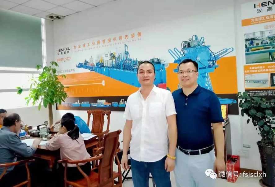 周天首先前往參觀漢高機(jī)械研發(fā)、生產(chǎn)車間后,聆聽肖遠(yuǎn)平先生、呂海輝先生兩位關(guān)于高端工業(yè)用管裝備和不銹鋼水管設(shè)備的特色說明。漢高機(jī)械致力于為全球工業(yè)用管智造領(lǐng)先裝備,不僅受到國內(nèi)久立、武進(jìn)、德威、鎮(zhèn)海石化、粵華等國內(nèi)知名不銹鋼管企業(yè)的好評,還大量出口海外。在交流現(xiàn)場,周天還偶遇漢高機(jī)械在澳大利亞的用戶PETER先生。